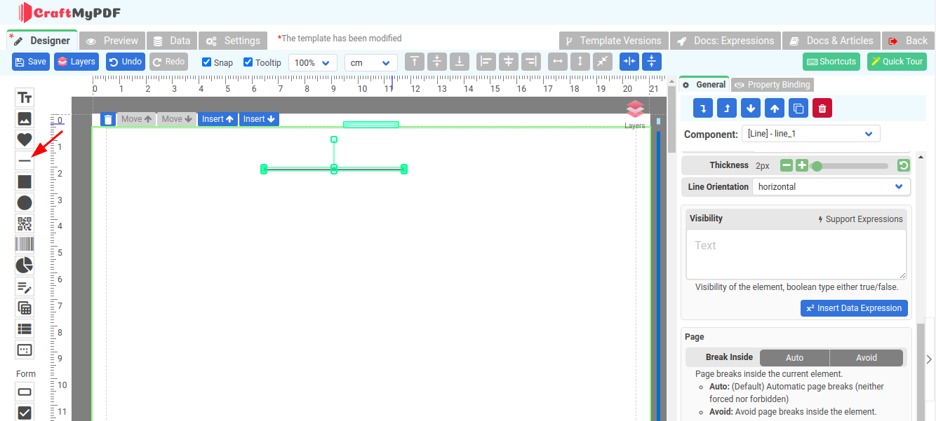 The line component is used to draw vertical or horizontal lines. To create a horizontal line, drag the component and drop it where you want it to appear. To make a vertical line, select "vertical" for the Line Orientation. You can also change the Thickness or Color of the Line component.