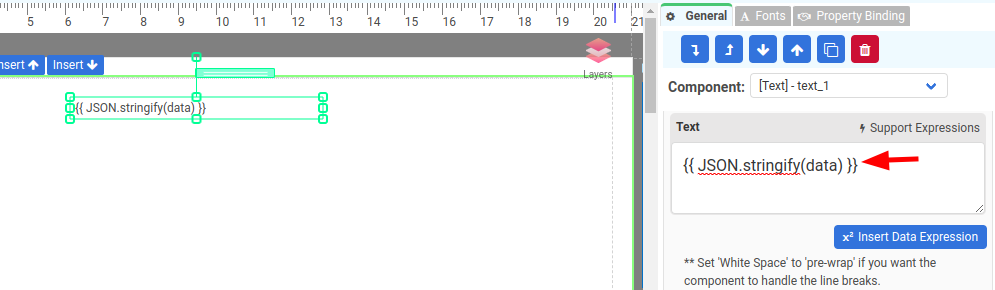 If you are unsure about the actual JSON you are receiving during testing or debugging, you can use JSON.stringify to display the JSON data in your PDF using a text component as follows:
